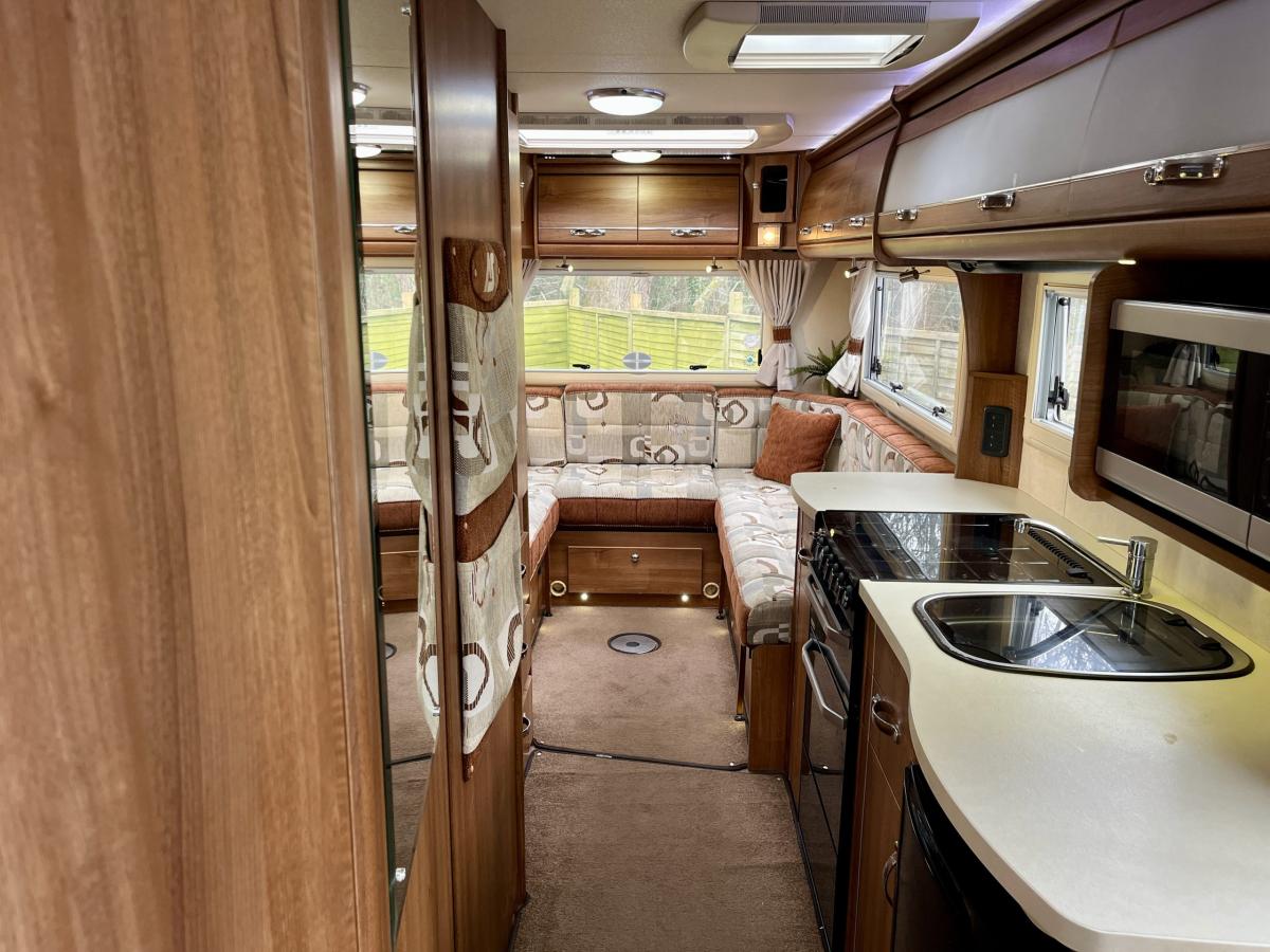 Side habitation door leading to a vast front washroom with a cassette toilet, wall hung mirror, LED lighting, vanity sink with a storage cabinet and a large separate shower cubicle. Side kitchen with hot and cold running water, large worktop space, a 3-way fridge with freezer compartment, a full size cooker with a grill and gas hobs, overhead storage and a built in microwave. Large rear lounge with a wrap around seating design, overhead storage, large skylight, speakers and a freestanding dining table. The seating will convert either two single beds or a large double. Tailored carpets throughout, fly-screens and blinds, wardrobe with a clothes rail and drawers, dining table with a storage compartment, 3-pin sockets, LED strip lighting, LED reading lights, stoarge for TV brackets and inlets, Truma central heating system and a power management system.