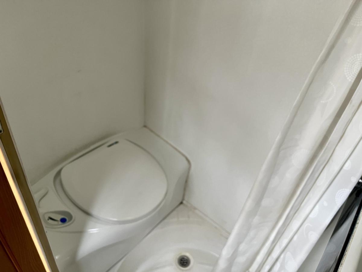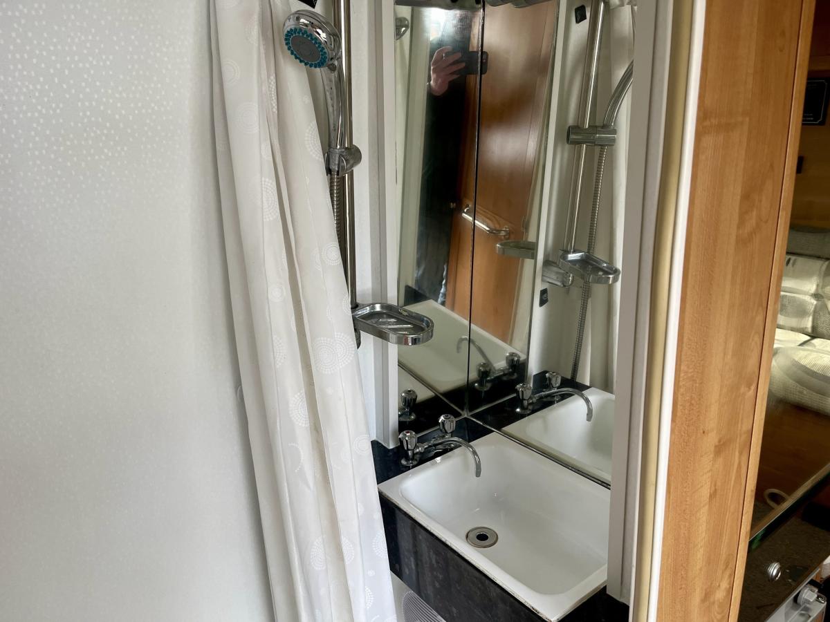 Side habitation sliding door leading to a side washroom with a cassette toilet, vanity sink and a shower. Side kitchen with hot and cold running water, gas hob, grill, ample worktop space and a fridge. Rear wrap around lounge with a wall mounted television, overhead storage, overhead skylight and side windows to flood the space with natural light. This will convert into a transverse double bed. Over cab storage, a wardrobe with a rail, coat hooks, flyscreens and blinds throughout, 3-pin socket, truma hot water and central heating system and a power management system.