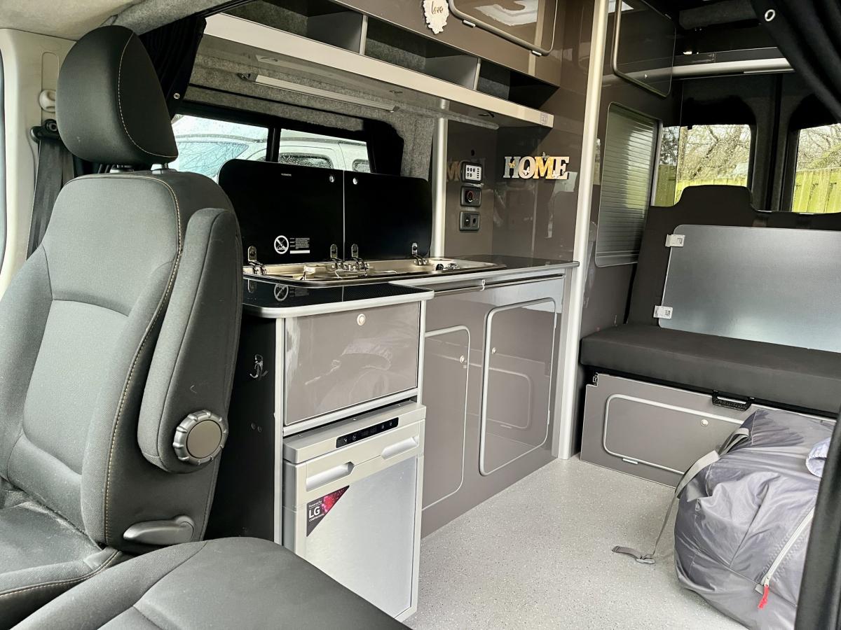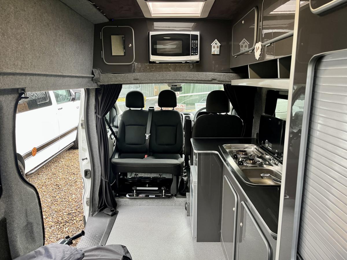 Externally the vehicle is finished in White, with contrasting Black trim front grill and bumpers, High top roof, privacy glass to the rear, twin sliding hatch windows, mains 230V and fresh water inlets, rear barn doors and Black leisure decals.