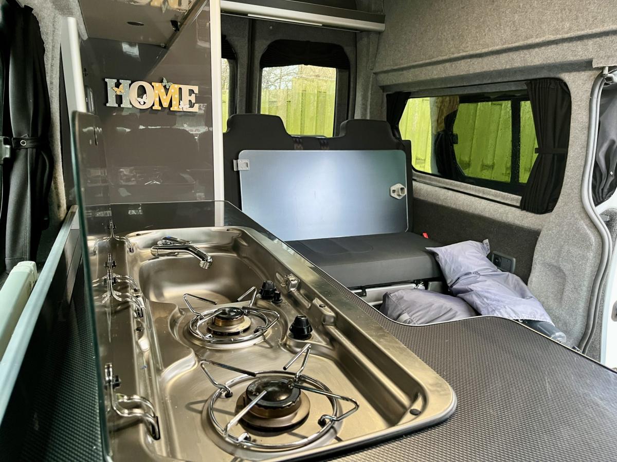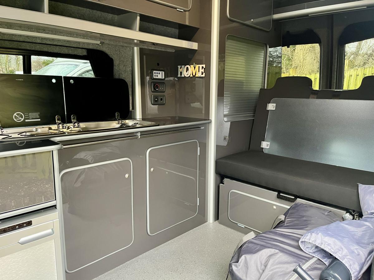 Side sliding door leading to a side kitchen with running water, tap and sink, twin burner gas hob all with glass lids to enhance work top space, a fold away dining table, overhead storage, a 2-way fridge plus storage beneath. A rear bench style seat with two additional designated travelling seats, this will convert into a double bed via a Rock and Roll mechanism. Privacy curtains throughout, Gloss Grey cabinetry, smoke detector, drop down television, skylights and a built in microwave.